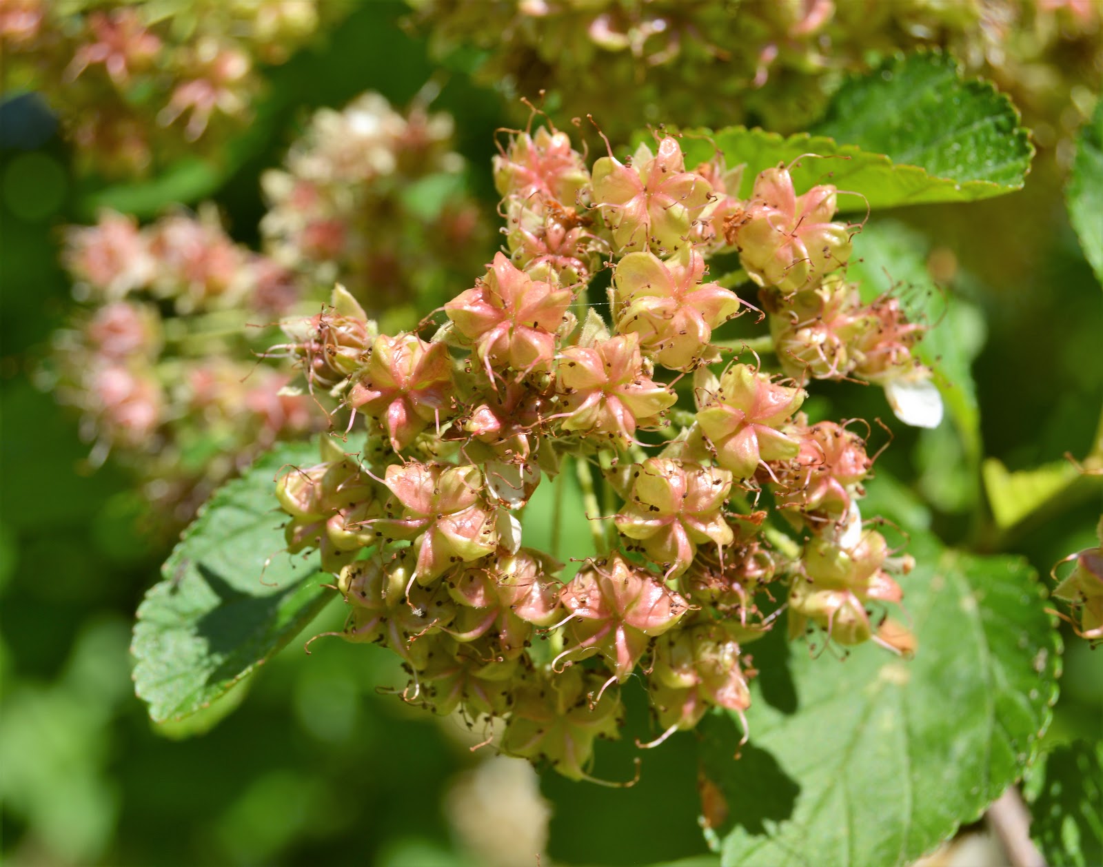 Typically the botanical epithet given to a plant describes what you can expect from that plant. For physocarpus opulifolius, physa = bladder and karpon = a fruit. You can see that play out in the forming fruit below.