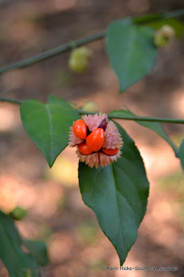 Another showy berry comes from the Hearts-a-Bustin (Euonumus americanus) shrub. We grow these at the woodland edge where they enjoy the light shade of the understory habitat of the hardwood forest. These shrubs go unnoticed most of the year, but when the seed capsules burst open to reveal the bright red berries, they are show stoppers. Eastern bluebirds, wood thrushes, yellow-rumped warblers, northern mockingbirds and wild turkeys devour these berries and disseminate the seeds.